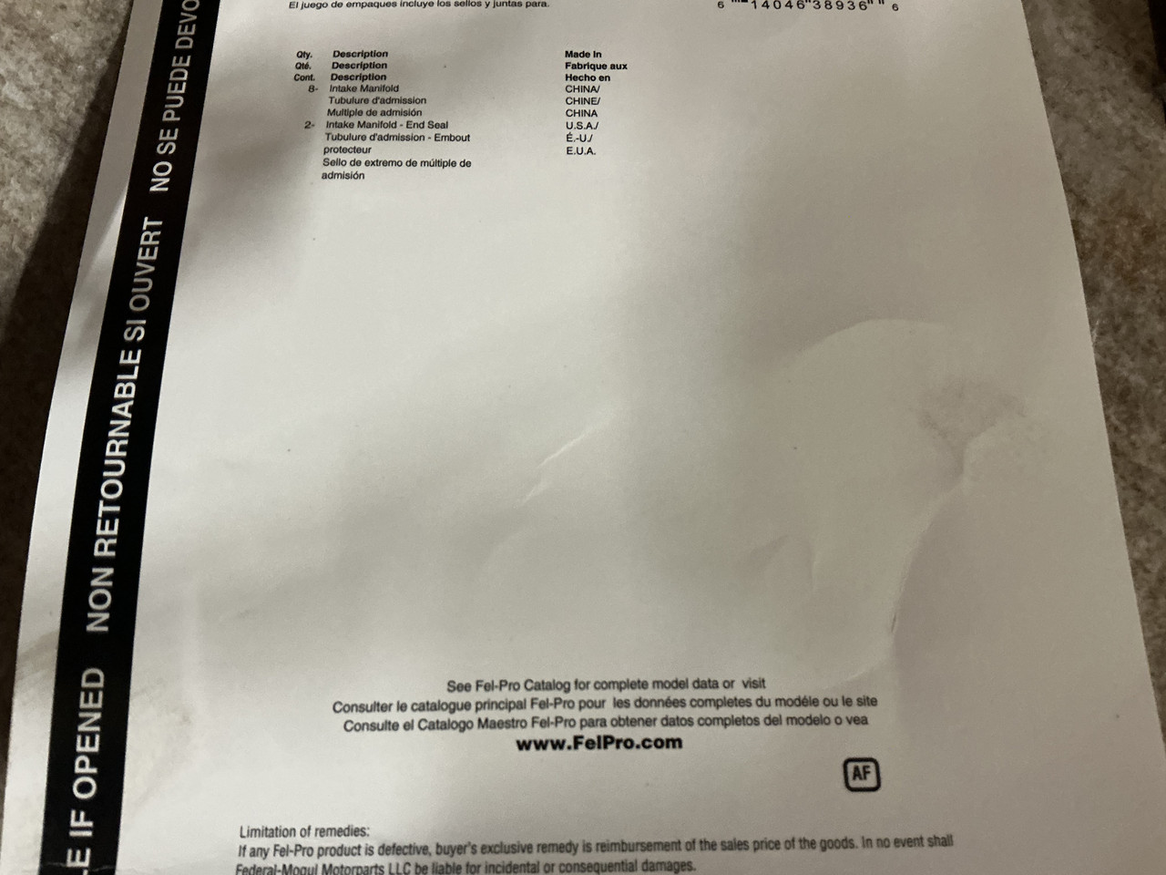 Wow! Even says "country of origin/USA" on the package. Hay  Jimmyt That’s, for the O rings. I should have provided proof of the China connection on the FelPro gaskets.   For further explanation, the FelPro packaging shows that the 8 gaskets for the intake were produced by China. But the two end seals are from the USA. The end seals are just two pieces of open cell foam that go on the bottom of the manifold and are there to just minimize trash build up under the manifold and are not necessary for proper operation of the engine.