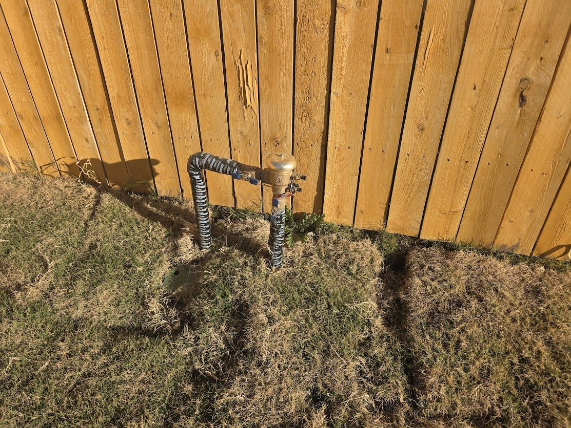 Brian, that above ground piping is a back flow preventer for an irrigation system, or at least I think that is what it is. It should definitely be covered, maybe with a bucket and a drop light. Those are VERY EXPENSIVE to repair/replace. Hay  Jimmyt Ahhhhh! Thanks for that, I updated 'em. Still need to get it taken care of, but not the main water shutoff for the whole house. That makes more sense! If they have a pool, it could be for that, but I didn't hear you mention a pool. Hay  Jimmyt