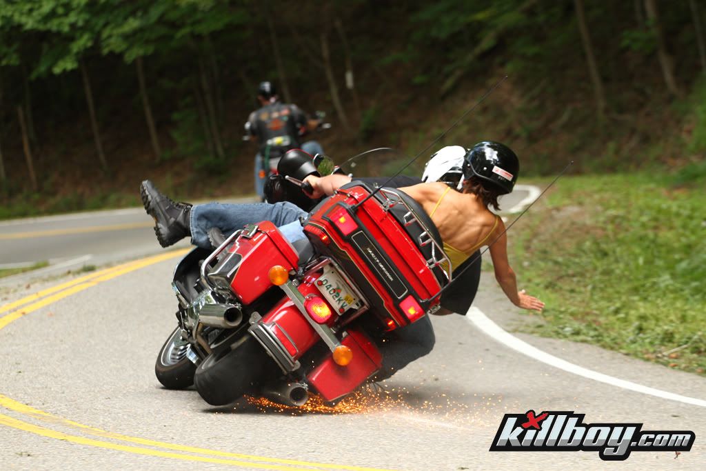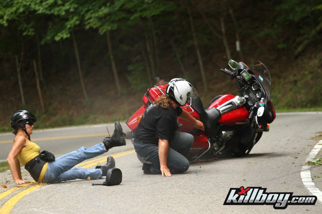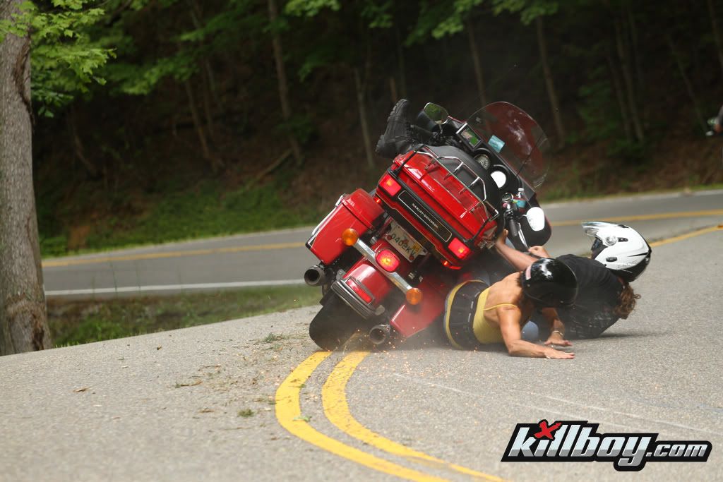 That bike slid maybe 2 or 3 feet away from the riders before it started to turn in.......had to be going pretty slow.  The last time we were at the Dragon, the hardest part of the ride was being behind a pack of HD riders going so slow you couldnt lean for fear of falling over............maybe insufficient speed to hold that baby up in a lean was the culprit here.  At least the bikes in front of us must have got the memo, they werent hardly leaning at all, kind of counter leaning like you do in a parking lot.  Eventually they pulled over to let a couple cars and our bikes go by