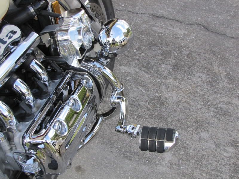 I have 2 sets of pegs, and a mount from Longhorns, so I just mounted some Longhorn offsets on the vertical part of the bars. I have a 31 inch inseam. This is comfortable if I lean back against the backrest. And it could swing in just a bit more also.