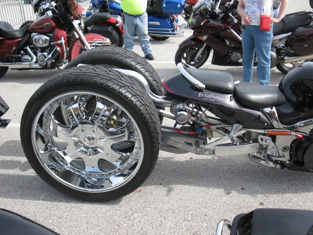 Actually BigAl it was often done in the 1970s using special triple trees on Bikes with side car and on some three wheelers. Everyone who had them and talked about it, really like them in combo with car tires on the rear and side car. Got lots better mileage as expected and better ride and handling according to them.