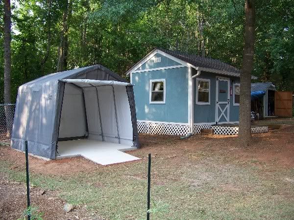 The shelter kits can be had for ~$200.....I had originally planned to frame up the slab when the cover is shot, but I like it the way it is...since it's not insulated, I don't have problems with dew forming on the bike....I installed a sleeve in the front corner in case I want to run power or air to it one day...