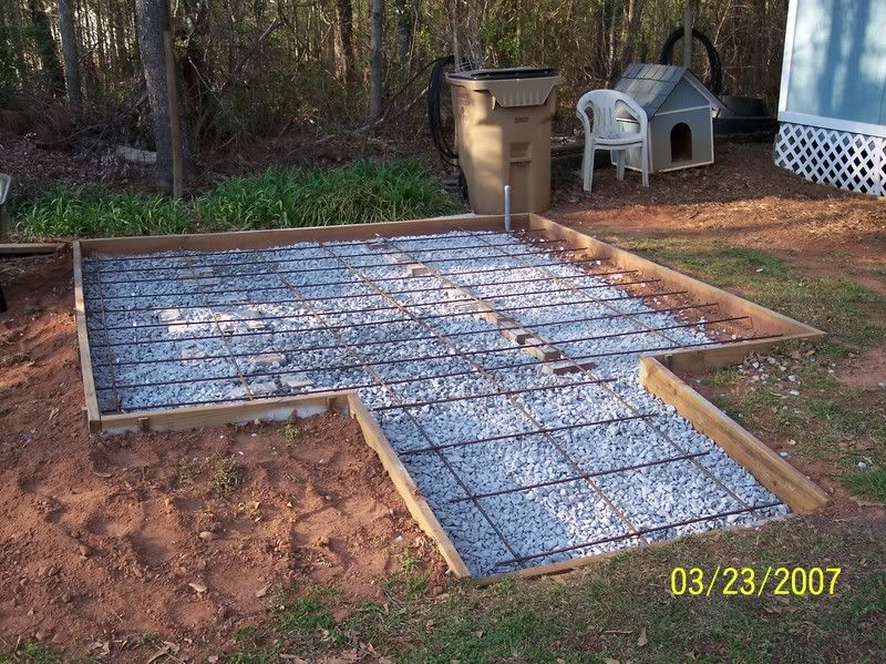 I had it formed up and even had the re-bar in it and I think the guy charged me $500 for a 10'x10' with the ramp.....I thought that was a little high, but they had to get the concrete through the fenced in yard without getting a truck close to it....they also put a plastic vapor barrier in it before they poured it....keeps the moisture from coming through the floor....