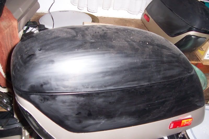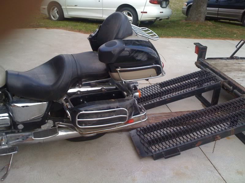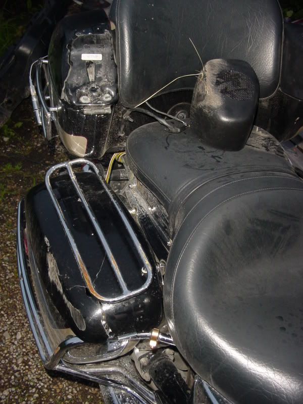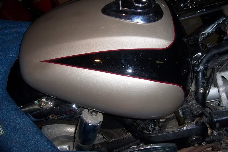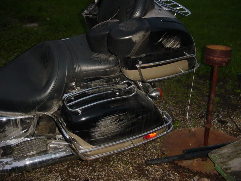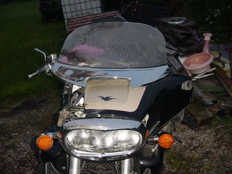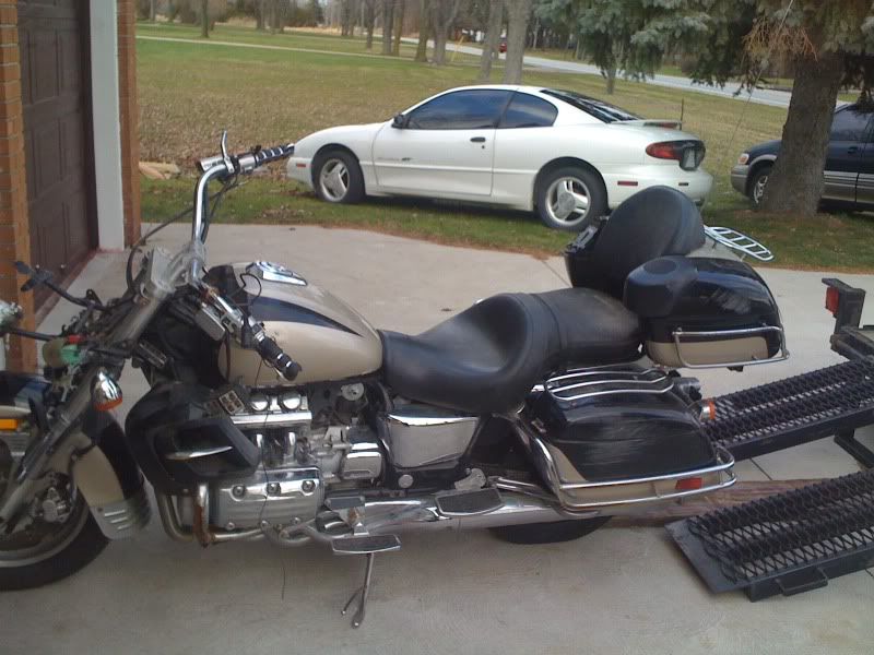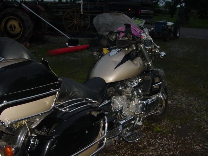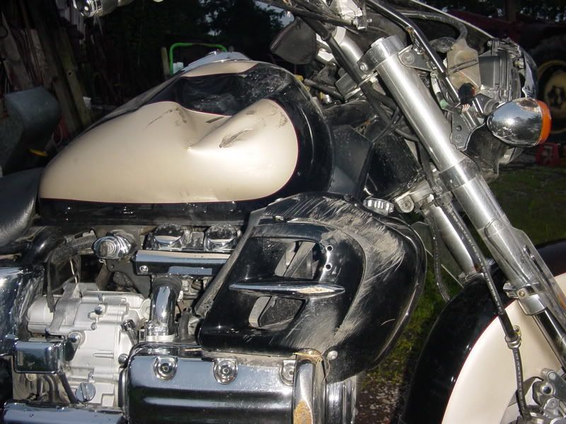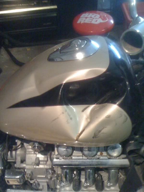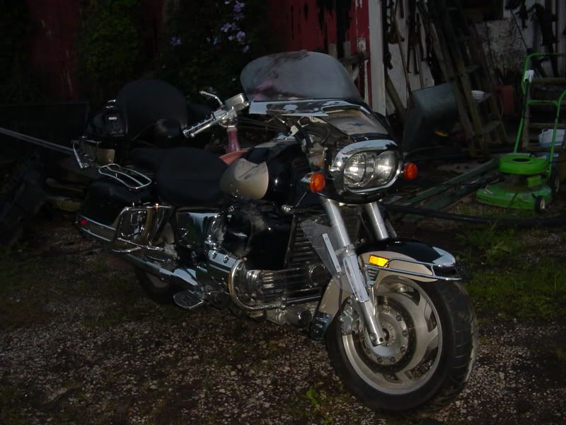 Hello all. My name is Drew, 25, from Windsor Ontario. I just wanted to share my little story with all who want to hear. If I have free time, and I'm not in the garage, I am usually playing paintball. I'm also in a band www.ravenscode.com for those curious. I work full time and go to school full time, so it has been a slow going endeavor, but I am finally seeing the light at the end of the tunnel.    I started fixing up my bike with the help of my friend Wayne in October of 2010 Here is some photos of the bike where it had sat outside for 1 year, after being removed from a barn were it sat for 4 years.           As you can see I had my work cut out for me. Here are some photos of what arrived at my home         As you can see, we had to use a wood plank to lower the bike off the trailer. Unfortunately both front and rear brakes at the time were completely seized, and the plank pushed off the trailer. Both of the exhaust tips slammed down pinching them pretty bad. Just add it to the list of problems. Hahaha So basically, the story of the bike is as follows. A man some of you may know, went by Borderbob when he was a member on this forum, was hit off of his bike by a wild turkey. He did sustain some very serious permanent injuries, which I won't get into. Although I can tell you he is very healthy today and still riding a Honda goldwing during the summer. The bike ghost road for some distance before hitting the soft shoulder, which laid it on one side. It skidded for some distance before flipping onto the other side and skidding some more. Almost all of the chrome protection rails are written off, they did do their job. Honestly if it wasn’t for the panyard rails, crash bars, and rear speakers, there wouldn't have been any bike left to repair.   My process has been very simple. Take a part off, fix it, and shelf it. I am being extremely thorough. No rust, even if hidden is being left on the bike. Also I am sealing all hidden areas prone to rust.   The blue is the chemical I am using to help loosen the rust. It also chemically changes the rust so it will not spread further.  The panyard lids where heavily damaged. It was like the most un-enjoyable puzzle ever. I fibreglassed the inside, and body epoxy filled any gaps on the front. They aren’t painted yet, but here’s how they look so far just primed and prepped for my colour match.   Now one thing you should know about me is I would rather put 100 hours into something rather than pay to replace it. So I did decide to repair the fuel tank rather than replace it. I did bring it to a friend’s so called “connection” who could “hook me up” on the cheap to repair the tank.. I got laughed at, and told it couldn't be repaired, and I have to replace it. Well that’s all I needed to hear to just jump in head first and prove that guy wrong. With the help of my neighbour Wayne, a great lifelong friend, mentor, and just simply “that guy you know that can fix anything”, we drilled the spot welds out of the bottom, and cut a large access hole. Pounded out the dents and worked the sheet metal for what seemed like an eternity. We ended up with less than 0.010” of body fill, which I am extremely proud of. We used a Chrysler black, which has a flake in it, and matches the stock colour very close, and a pearl beige Toyota colour, which I cannot see the difference even in the sun.   Wayne in the photo giving the tank coat number 2   Other than that, I did have to purchase some parts. I got new handle bars for free, not original, but close enough. New grips for 10 bucks. I watched eBay for a year before I got a good enough deal of the fairing. (Student here, so I is very cheap) Got this beaut for 160$, and lucky for me, THE RIGHT COLOUR! WooHOO! Also found some good used gauges, also on eBay, for 80$ Just bought the last part I need for the fairing, minus a windshield, last week. Found the front headlight pod, snagged it for 60.   -Rebuilt the brakes -Replace rear suspension (new progressive shocks came with the bike. BONUS!) -replaced many wires -new battery -cleaned carbs (Bike actually started within 5 minutes after 5 years of sitting. AMAZING!) -new plugs and wires -new keys Thanks for reading. Hope my horrible grammar wasn't too distracting! Cheers! Drew