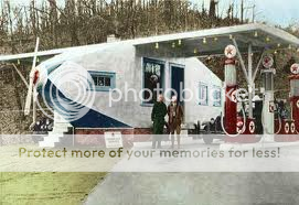 That is a nice little slice of Americana.  It's interesting how things change slowly- people driving from all over the place to see the airplane gas staion- we amused easily back then.