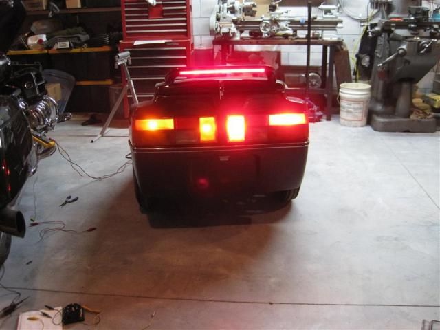 Powered up by a battery, brake lights only. One side LEDs the other is one 1157 and one 23W 5007. It does look better at night but not great.