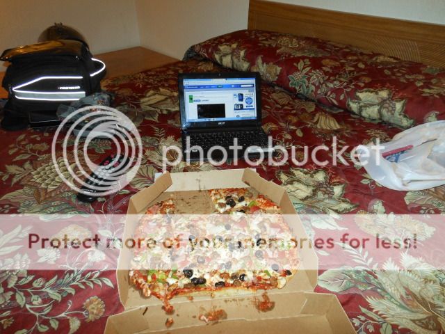 So, I got a room at the Super 8 in town.  The clerk was cool and a biker as well.  It was what you would expect of a Super 8 - a little threadworn but fairly clean.  I ordered a pizza and spent the evening cooling off and watching the weather channel and catching up on the Wolfpack and uploading pictures for the day.  I got to rehydrate with a 2 liter Cherry Coke with the pizza.