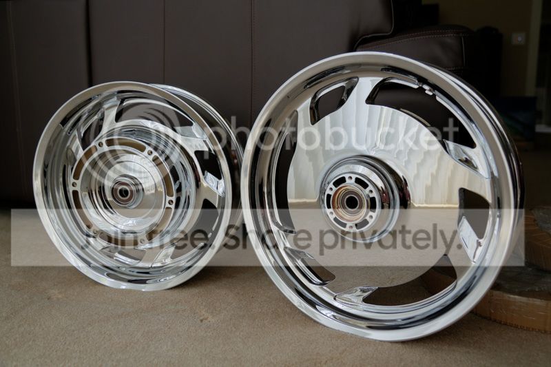 I finally got my chrome wheels from Chrome Pros Plating out of Corpus Christi, Tx. There's a long wait list as they struggle to get suitable cores and then have to wait for each customer to strip the cores down to be returned. They've recently begun to speed things up by offering to put in new bearings and strip the old ones out of your cores for a seemingly reasonable price. This is the second set I've gotten from them as I am very pleased with the first. I have to say though that this set isn't quite up to the high standards that I got with the first set. Small imperfections can be found. I used some polish to get rid of most of it and overall I'm happy. If you've considered going this way I thought that some pictures might help. I don't have any affiliation with this company other than I'm their happy customer.