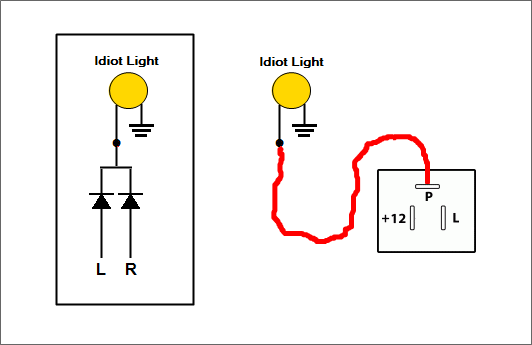 though you still have to join the left/right wires together on the idiot light, and configure a ground wire. I just haven't found a Port flasher that blinks at the proper rate at least to my eyes. With leds on the front signals only, the flashing was okay. With leds on the front and the rears, the activated side's flashing was retarded, but for a 4-way flashing mode it's probably not an issue.