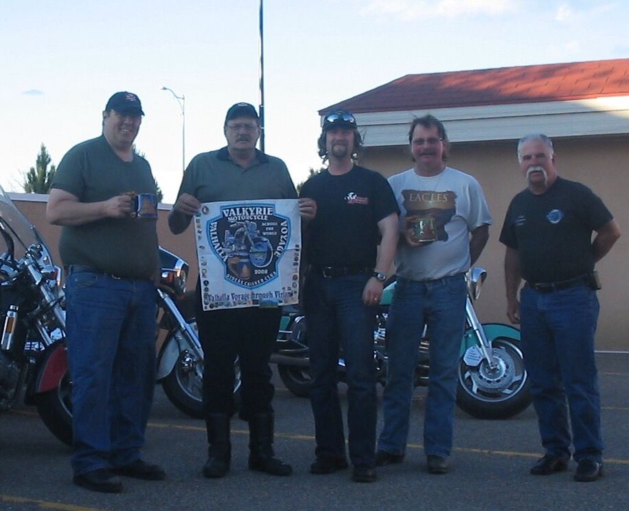 Thanks, Willow. I'll see what I can come up with when I have some time. Because it was eight years ago, I have no idea what pictures I took, But I remember that after we got the mugs from you, Mike (from Hinton, AB, I believe) took the mugs up to Edmonton. Mike and I are on either side of you in this picture (Mike in white), taken in Lethbridge, AB. I wish I could remember the other two fellows.  I was a little less shaggy previously (and since), here receiving Thor's hammer from Montana's representative: