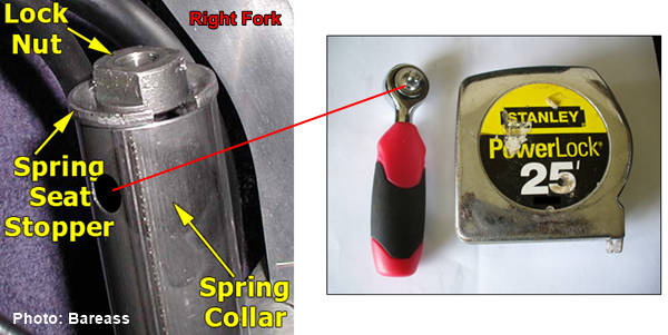 Britman, fantastic pictorial. When I worked on my forks, I didn't use a screwdriver to remove the spring seat stopper. Forget already, but maybe the screwdriver kept slipping or I just couldn't find enough leverage or needed four hands. I found the best tool to push down the spring collar is a ¼-inch drive ratchet (second pic). A stubby ¼-inch drive is definitely more comfortable than the standard ¼-inch ratchet. You stick the ratchet's ¼-inch square head into the hole on the spring collar and push down the spring collar. The ¼-inch square head fits in the round hole just about right. (The spring seat stopper has a slot [inset pic] which you can use to stick the screwdriver's tip under the lock nut then pry down the spring collar. When there's a large enough gap, the spring seat stopper pulls out.) Another thing, it'll be simpler if they called the spring seat stopper a *keeper.*  ------------------------------------------------------------------------------------------------------------[edit] I used a ¼-inch drive ratchet to push down the spring collar, but there's that slot (red rectangle) that you could use the tip of a screwdriver to pry down the spring collar just the same. It just didn't work for me. The spring collar is stacked on top of the coil spring. The coil spring pushes the spring collar up against the keeper (spring seat stopper).