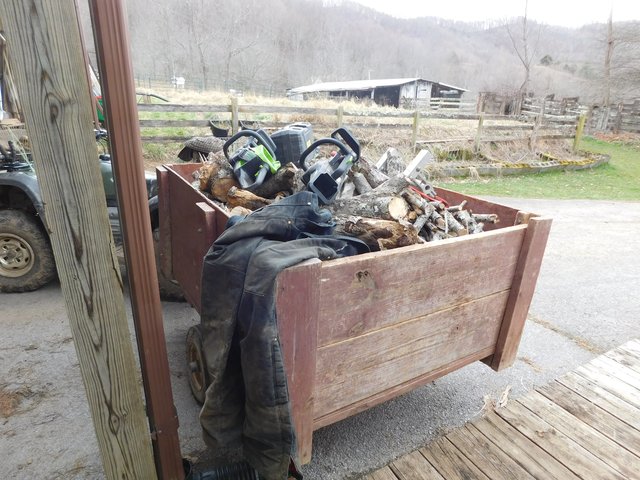 So glad it's raining today.. Had a good mate stop On Thursday -Monday to give me a hand. On the farm.. We worked to death Thursday -Sunday.. Then I worked hard Mon and Tuesday. To get done before the rains.. Mondays' long day.. . It did take a short break ,around 3pm.. 1 saw 2 batteries . They were big ass logs.. But my Big GW did fine .. I did buzz through 2 batteries thou.  And I split it in the shop well at the front of the bay  Tuesday I cut up the tops.. The wood was on the wagon but parked into position for unloading . But I will have to move it. After most of the squaw is unloaded there are a few pieces that need to be split . I'm glad I didn't put the splitter in it's hidey hole.  WOW , That was more splitting then I really wanted to do . yesterday. But everything has been blown refueled, put up.. I had finished by 6:30 last night.  Bike back in place , I did throw my leg over TheBeasts saddle and voted before I did all of my cutting. Oh Tuesday . When I had thought about it . I knew I wasn't going out after all the work.. Glad I did that first a nice little 8 mile run..On a Beautiful March day. We hit 63* on the mountain At least I only have a few things to do today... I need 1/2 day off. Really glad it's raining..