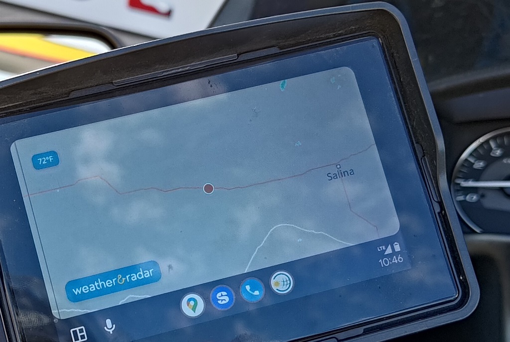 I found a great weather app that displays radar, wind speed, temperature, and other weather info on a very good map. That takes the guesswork out of when to stop for rain gear. I use this in my other vehicles as there are only one or two Android Auto enabled apps that show your location on a weather radar map.