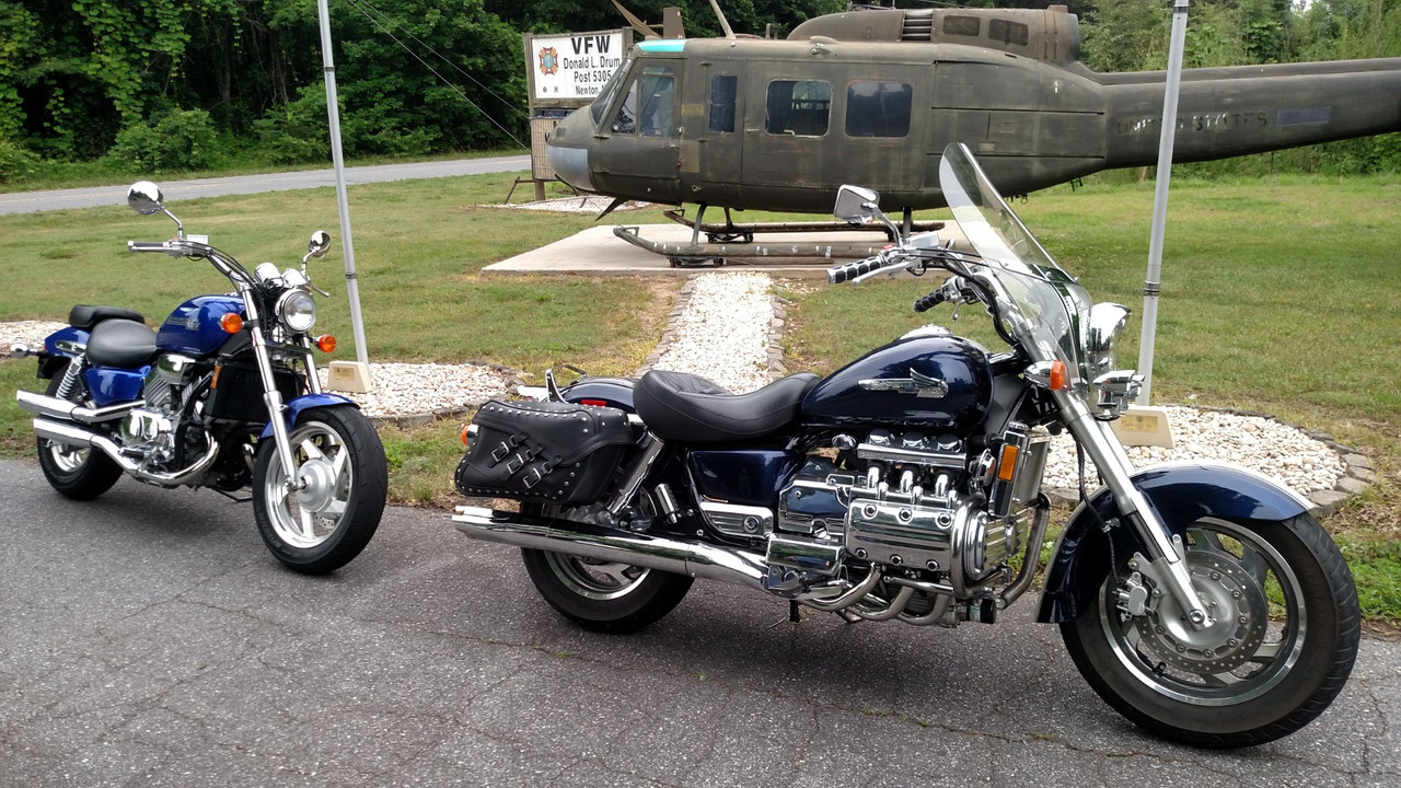 The other time was last weekend with my Son. He started riding a few years ago on a 2003 Honda magna 750. I joke with him telling him to get rid of that mini bike and get a Valkyrie. He says the same thing I said before I actually rode one as far as being too big and he thought it would be hard to handle. My second Valk is a 2001 blue with the white stripe so I finally got both colors because it was a hard decision when I picked the black one back in 2001. Bought it for $3000 just in case I couldn't find parts for my 1999 but it is as nice as my 1999 so I did all the service and put new tires on it and ride it every 3rd or 4th ride. I took it last weekend and asked my Son if he wanted to ride it and he did. We swapped and I followed him. After a while I wanted to swap back and he didn't seem too happy about that. We stopped at a store for a drink and he told me he was surprised at the way it handled and was impressed with the power. His Magna at half the engine size has almost identical 0-60 and quarter mile times as the Valk they just go about if different. His Magna really comes alive at the same rpm the Valk is near the redline. I told him it won't be long and you will buy a Valkyrie to which he says why I already have two. Not yet Grasshopper not yet. I have rode a lot of motorcycles over the years but nothing as good as the Valkyrie.