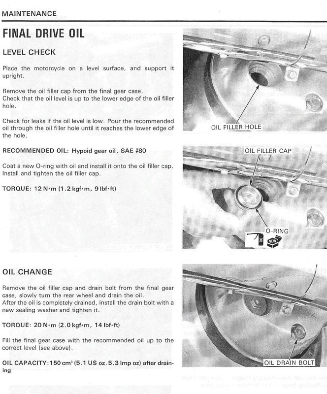 Additional question: does anybody know the size of the "O" Rings? I like to have some spares just in case. I will lift the bike; I plan on flushing twice using regular oil and spinning the wheel for a few minutes before I put the gear oil. I also have a syringe with tip for tubing so I can get around the exhausts if need it. I will also use Hylomar Blue thread sealant. Any info on "O" Rings will be appreciated. Thank you.