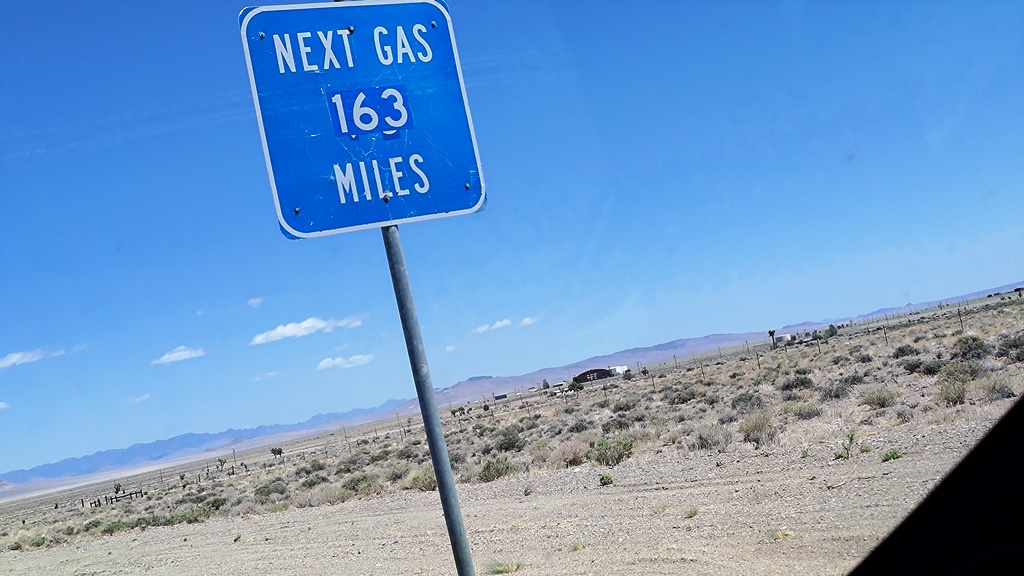 That sign in on US-6 between Tonopah and Ely, Nevada. When I was there I saw a Tesla on the side of the road, 9 miles short of Ely. Since that's the longest stretch of road in the lower 48 without gas (or charging), I suspect the owner wanted to prove a point. But he came prepared. He was plugged in to a generator or large battery pack in the trunk. So he may have been delayed but wasn't stranded. And he could still brag about driving his Tesla across that famous road.