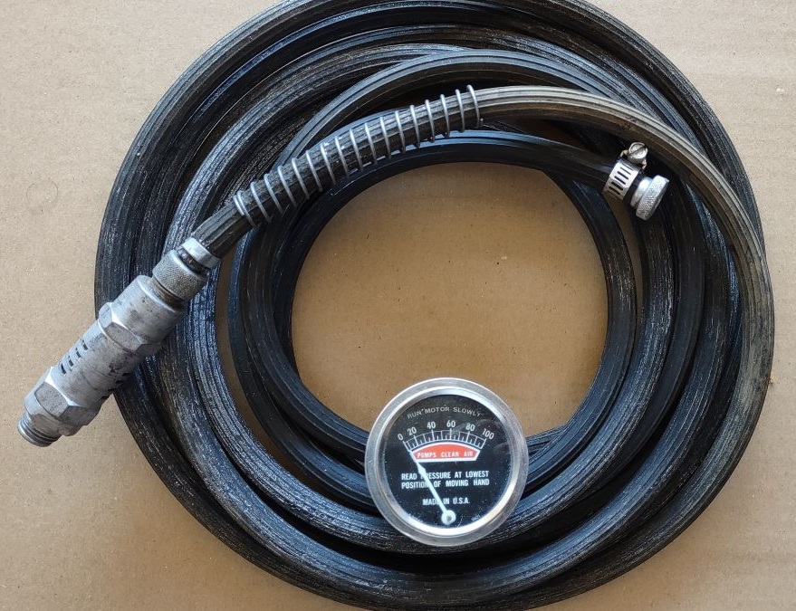 To inflate both tires I used a 'spark plug inflator'. These consisted of a hose with a fitting for your valve stem on one end, and an air intake and pump on the other. You threaded the pump into a spark plug hole and ran the engine at idle. A diaphragm and one-way valve made sure you inflated the tire with fresh air, not fuel. It worked very well and inflated a tire in a minute or so. The device is shown below, and still sits in my garage.