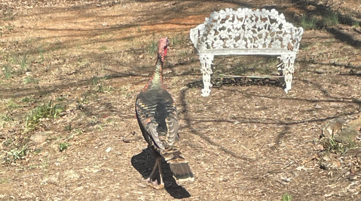 A couple of large turkeys came into the yard today. Carolyn took some pictures and a video. The video shows Nala the cat hiding in the bushes in a stalking pose. I'm glad she stayed there!  -Mike THAT lookin like it just might be TASTY when cleaned and cooked properly!  RIDE SAFE.
