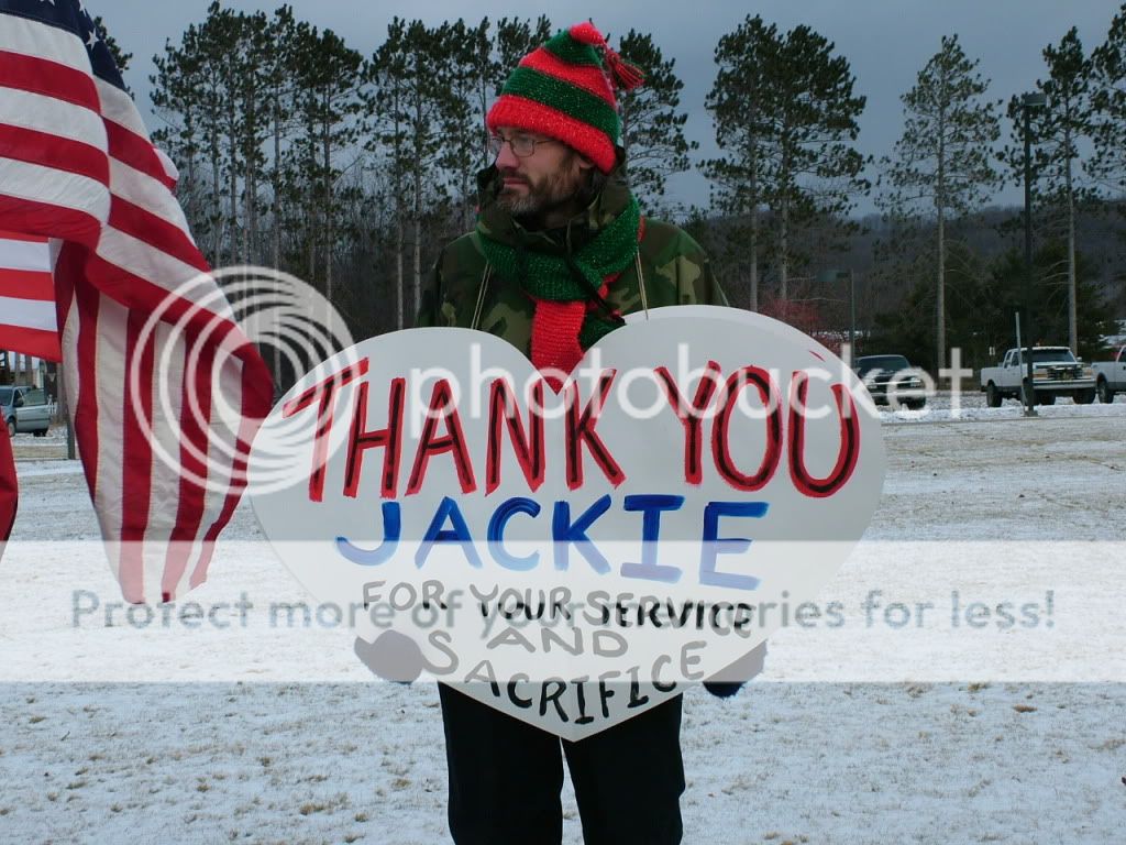 As a proud member of the Patriot Guard, I want to thank you for standing for Jackie, his family and brothers here and abroad. I have stood in too many of these, but I still go because it is the right thing to do. Again, thank you for being there.