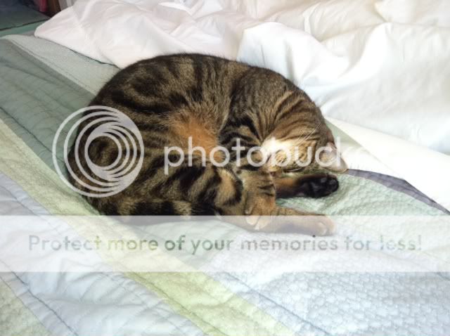 I have some mild allergies and sometimes come home to sneezing fits. So . . . the cat does NOT get to sleep in my bed. This is what I found after riding up in mtns for breakfast this morning. Cat doesn't seem to care about my rules.