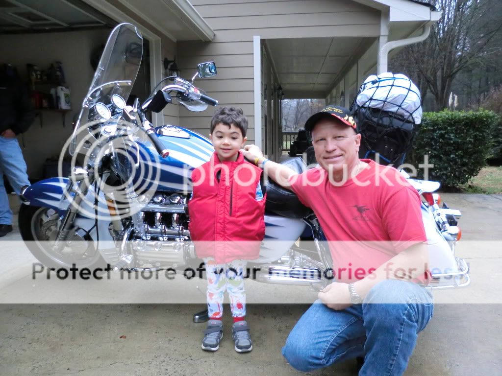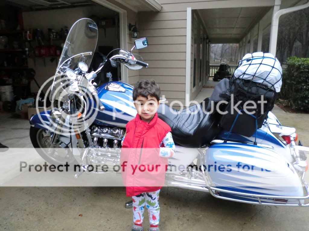 Joe and Wimp headed for Knoxville Sunday morning under overcast but dry skys. Before they left I invited my next door neighbor's little boy Brighton over to see the motorcycles. He loves mine and I always make it a point to honk my horn in front of his house when I'm leaving to ride....he's usually standing in the door way giving me his "ride safe" wave...