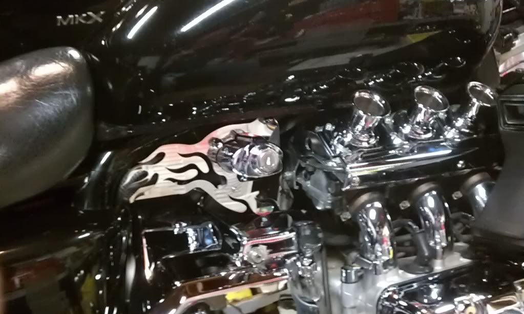 I called Wayne yesterday to buy some parts from him. How long does it take him to call back? I cant email him because I dont have outlook. If you have his email could I get it from you??  Dave, I see what you mean about the email links. They all want to go through Outlook, which is no longer supported by the later versions of Windows. But it appears his email address is: waynesworld32@aol.com Just use that in your regular email program. Also, there is an online order form you could fill out...but his site does recommend contacting him first. In all honesty, I'd give him a couple business days to respond. I don't have any affiliation with his website, but I've ordered two sets of hangers and two front radiator covers for my first bike(totaled out) and my current one. I've never had a problem dealing with Wayne. Ratdog, my buddy up in Seattle who has been a long time VRCCer can vouch for Wayne also. If you don't hear from him in a couple days, give him another call. You won't be disappointed with his product. I've included a pic of my right side hanger. It's not the greatest pic cuz it was taken in my garage and the hanger is reflecting something in the background. I can take better pics tomorrow, outside in the daylight if you want to see how it looks on the bike.