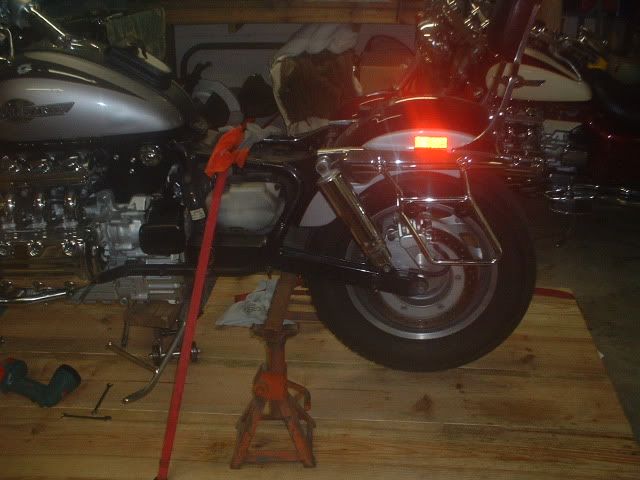 Three bikes in a 2 car garage means that I have to park one of the Valks on the table when it is not in use. Mission accomplished.  cooldude