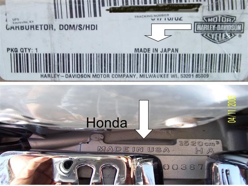 NUFF SAID compare apples to apples,, if you post a picture of a carburetor of a harley you also need to post a picture of a carburetor of a honda.. they are all made in japan.. also Jerry h said ""Union Made in the USA" - simiply means that the product was assembled by union works who live in the USA. Parts cannot be simply shipped to the USA, assembled in American factories and then add the stamp "Made in USA". that statement is contradictory,,,