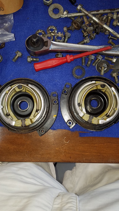 New brake shoes in the front, still cussing and throwing wrenches trying to get the retaining spring into position.