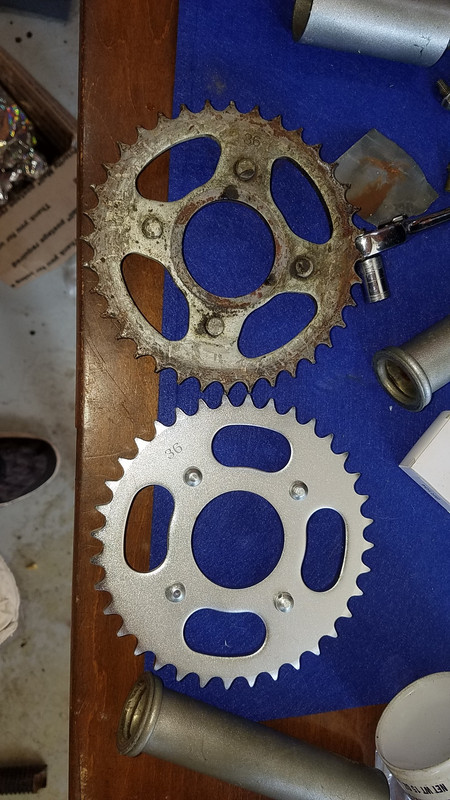 New bearing for front, rear, and steering shaft. Along with new sprockets and chain. Finally got enough parts in to start assembly of the rear axle.