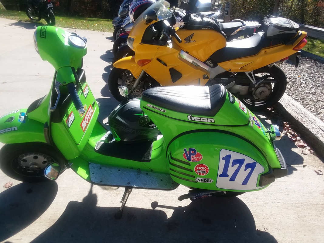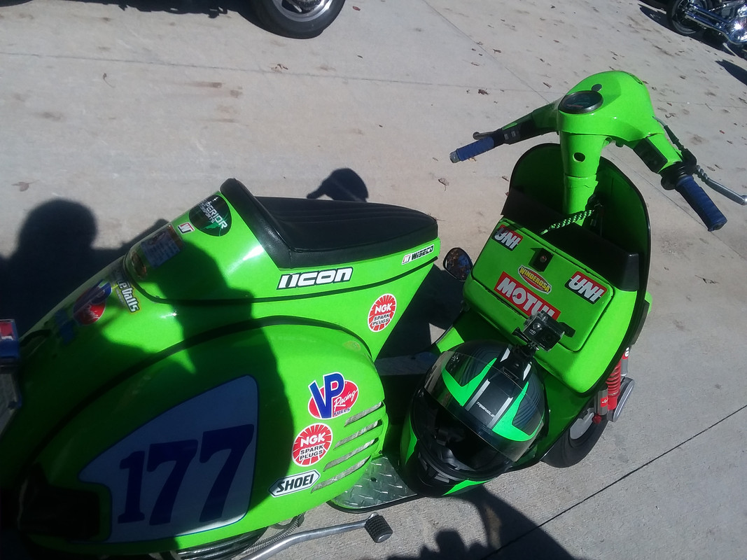 WOW, that Vespa was either stock 150 or iffy being 250cc and that much HP is INSANE. I doubt a 50cc even modded heavily can have that much HP. If HP figures are correct, that is the equivalent of our near 800lb. Valks having around 140hp - NOW that would be AWESOME wouldn't it!