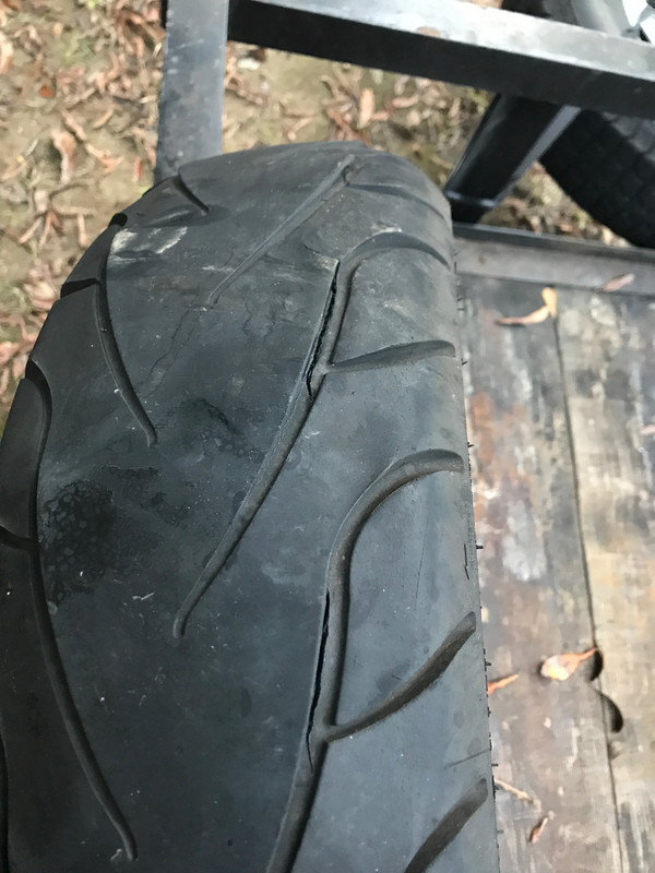 Mark, Yeah! Sphincter-tightening concerning!!! Hard to believe those ominous boogers were there! I've had remarkable service and mileage out of those tires, and I was comfortable with the idea of just using them every time the need arose. Another reason I've never gone D/S, is once I lucked onto these, I just never saw the advantage or need to justify the disadvantages... We don't have a theory yet on what might have caused them... We did carefully inspect the new one installed, though, and at least we're starting out with one with no cracks of indications of a crack... Close attention will be paid, you can be sure, over the course of this tire's life... We'll see... I can't imagine that you would get less than 20K out of your tire! At 20K, mine have always appeared 'nearly new'! Please favor us with a report on your experience... One caution I would add... be thoughtful when stopping on slick surfaces! Twice I've had one break loose on me while aggressively stopping. Once just after installation (less than fifty miles) on newly damp road and hard breaking for a stop light. Once on 'tar snakes', again, stopping aggressively for a stop light... These tires must be a bit 'harder' than others in order to produce the high mileage... With that firmness naturally must come a wee bit less traction/gripping power... I hesitate to blame the tire itself, because of the unusual circumstances those events occurred in... but... Be careful, my friend... I know you're a most skillful rider, but... outcomes ain't always in our hands!!! DDT  Wow, scary stuff, glad you got 'er fixed up for more aimless bug killing! +1 on the Austone car tar, with the caveat of some beefy 13" shocks. Your a tall feller so you could still plant your feet squarely on the terra firma. Seth, Lots of thoughts rolled through my mind as Dennis pointed those out to me!!! I've never had a 'blow-out', but I have had them go flat on me while riding... Talk about a 'sinking' feeling! No fun at all, and inconvenient as heck, but... that's just part of the experience, too. Yeah, I've heard an adjustment or two are in order when changing over to D/S... hadn't heard about the shock replacement, though... at least I don't recall that. Higher seat height isn't a big deal for this happy rider with an 'adequate' inseam... However, the new to me Russel Day Long saddle has a quirk or two that tend to offset that! Even with OEM shocks, I now have to slide forward a bit when stopping in order to 'flat-foot' our girl at a complete stop! Oh well, soon enough that has become automatic, and I don't even notice it now... With higher shocks, I'm sure a minor tweek and we'd do just fine. Thanks for your comments! Hope to see ya this summer, good Lord willing and body fully recovered! DDT