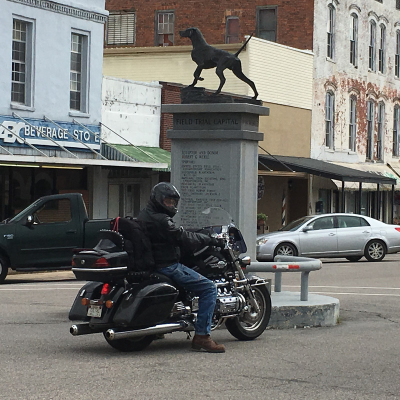 We made our way southward on scenic backroads, and we did have a rather delightful ride at that! The weather slowly, almost grudgingly improved throughout the day, and we did eventually have a photo-op in Union Springs, AL, at the ‘Bird Dog’ statue… Nearby are held field trials (competitions) for bird dogs, and this locale has become somewhat famous for that… Like in so many other towns, the folks in this one decided to commemorate their sole claim to fame…
