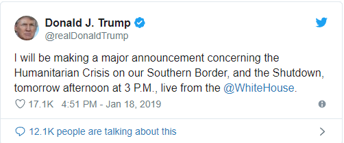 An end in sight, looks like Trump is gonna declare a state of emergency on the southern border to end the Democrat's government shutdown... (That's what I'm guessing he's gonna announce, but we'll see...)