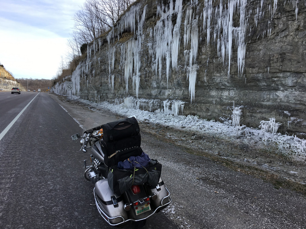 At any rate, it was even colder the third day than it had been on either of the first two! Driving head-on into a stiff northern wind at highway speeds on the slab... with the temps below freezing... Well, if you think that ain't pleasant, your are right on the money!!! I imagine I was much better off with my heated gear on full-blast, but, frankly, I couldn't tell if it was even working! Like I said, this will be a hard one to ever talk myself into doing again!!!