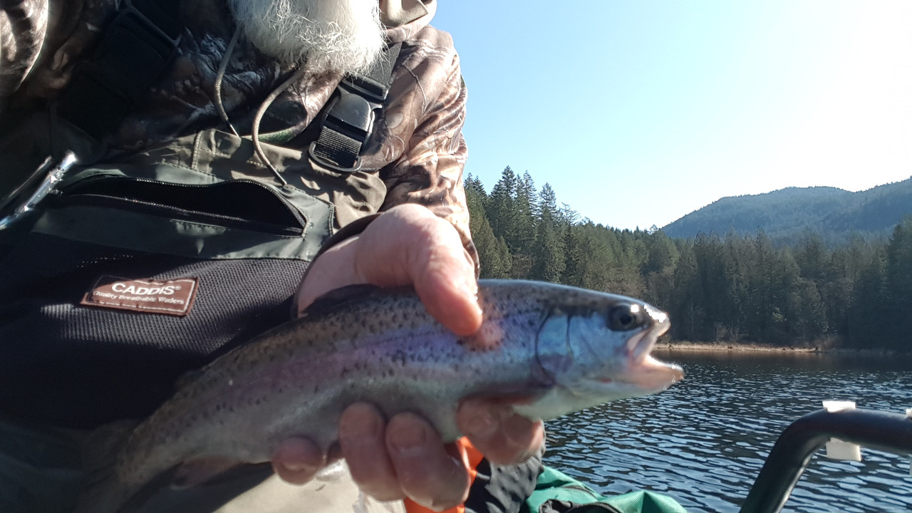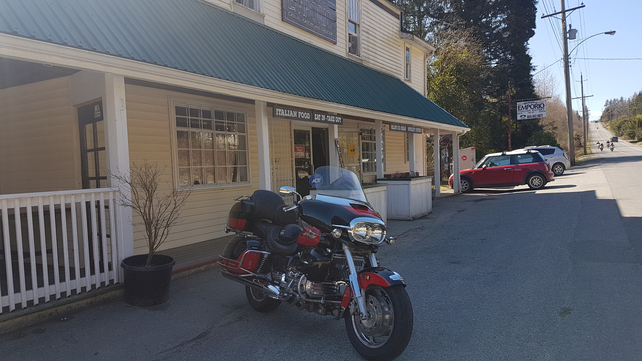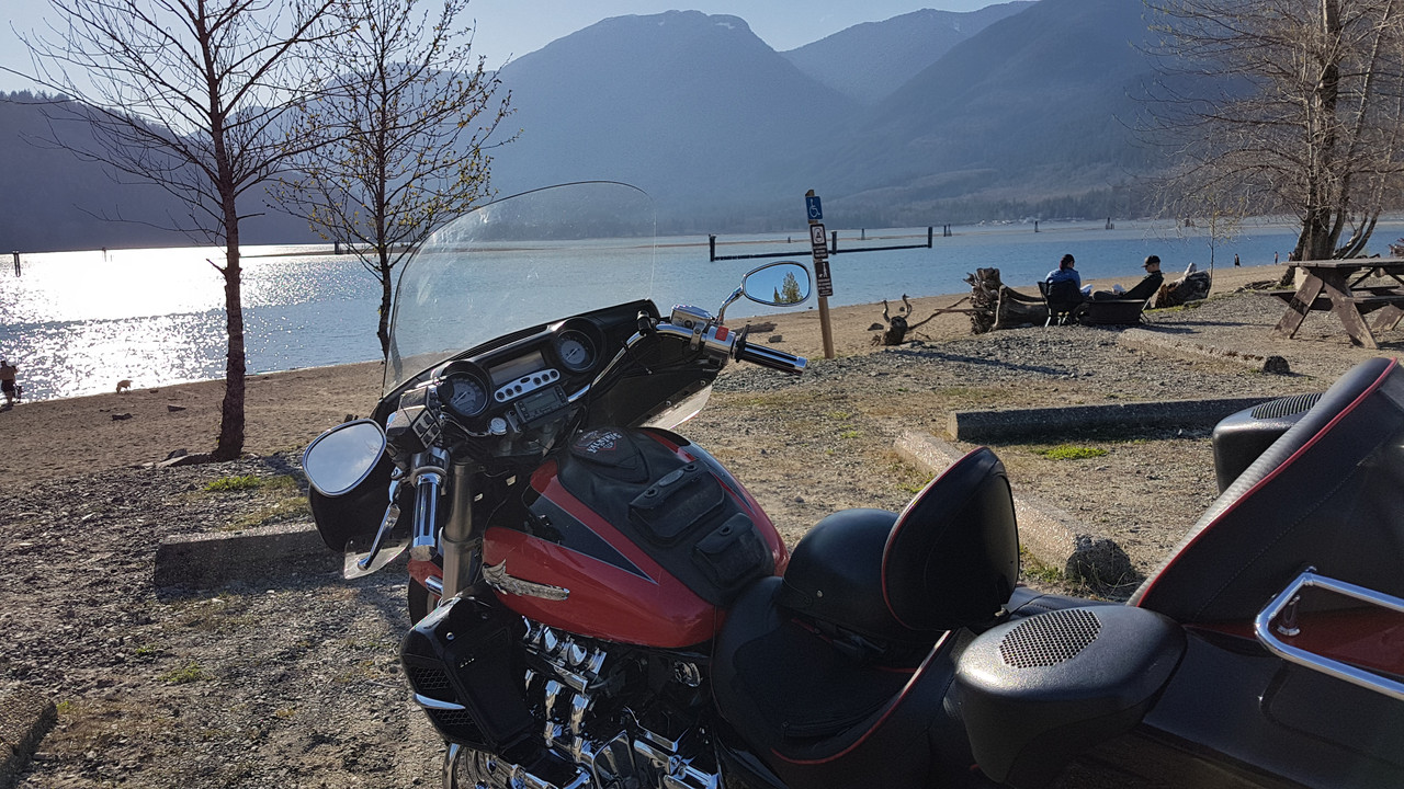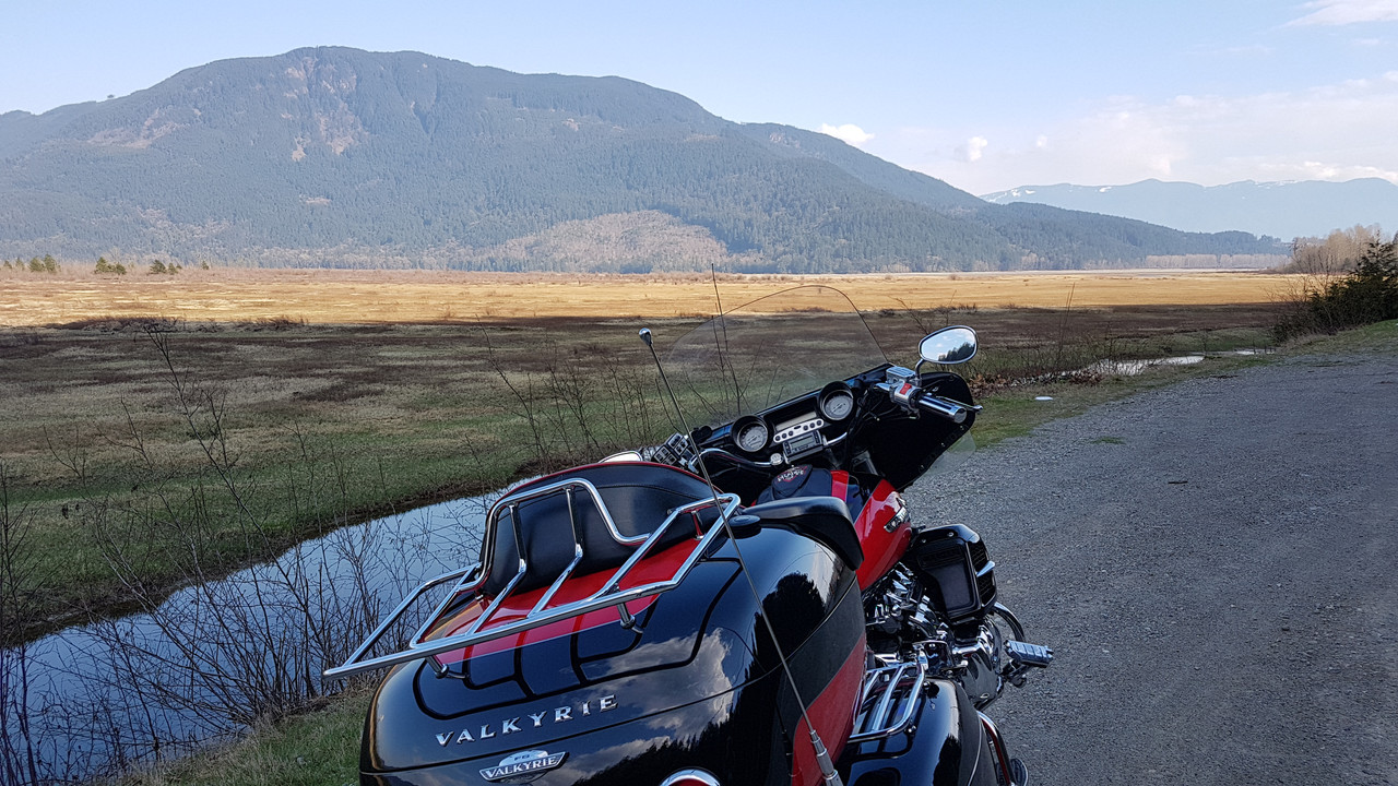 Well, Spring has definitely sprung here in SW BC...a gorgeous weekend weather-wise was not going to be wasted by yours truly. First up on Saturday AM was 5 hours or so up at Grace Lake … first fly fishing outing of the year as the lower mountain lakes in this area have been ice free for several weeks. Had pulled the pontoon boat down from the garage loft and assembled it the evening prior, so it was a quick getaway in the morning. Sure felt good to be wetting a line again  A beautiful and peaceful little lake...after the first hour or so the sun's warmth started to take hold  Nice rainbows up to 3-4 lbs in this lake...I did well with several in the 1-1.5 lb range  Having these fishing spots so close to home enables me to easily cram my two favorite pastimes into a single day. A quick changeover and I'm out on the Valk, with the temps in the afternoon reaching up to the low 70's!! First chance to try out my new key fob (after 18 years one has to start thinking real hard what chrome bits are left to add, without lookin' too tacky...I like it, but I'm sure my young buddy Beardo from Saskatchewan winced when I texted him a pic (he just LOVES chrome add-ons   )  Did a quick ride along Harrison Lake before switching back West along #7 to ride some of my favorite back roads    This is actually the paved part of the road up to Grace Lake, before it turns into a gravel logging road that will take an outdoor enthusiast to a multitude of lakes, rivers, hiking trails, and hunting spots.     About an hour and a half back on Old Dewdney Trunk Road towards our old homestead where we lived for almost 40 years before we moved a couple years ago, is this old general store that they've turned into a cool little roadside Italian bistro...kinda neat, being out in the middle of nowhere and they do have great food. I couldn't resist, treating myself to some delicious stawberry/banana crepes   It's been two years now since we moved far away from the urban sprawl that has beset the once peaceful little towns that used to make up the outer regions of Greater Vancouver area...we don't miss it one bit, and this is about as far West as we'll travel these days on our own time...unless it's to visit the youngest daughter. Rest stop at Kilby beach, about 5 minutes from home, on the Harrison River. A nice nap soaking up the late afternoon sun...man it sure is good to have Spring arrive    When I first starting posting ride reports, one of my inspirations for doing so was reading Smokin Joe's reports. Always enjoyed the photos and reading about the history of the places shown in his posts...and of course his "Money Shots". So in that refrain....hear's the "Money Shot" to wind her up...