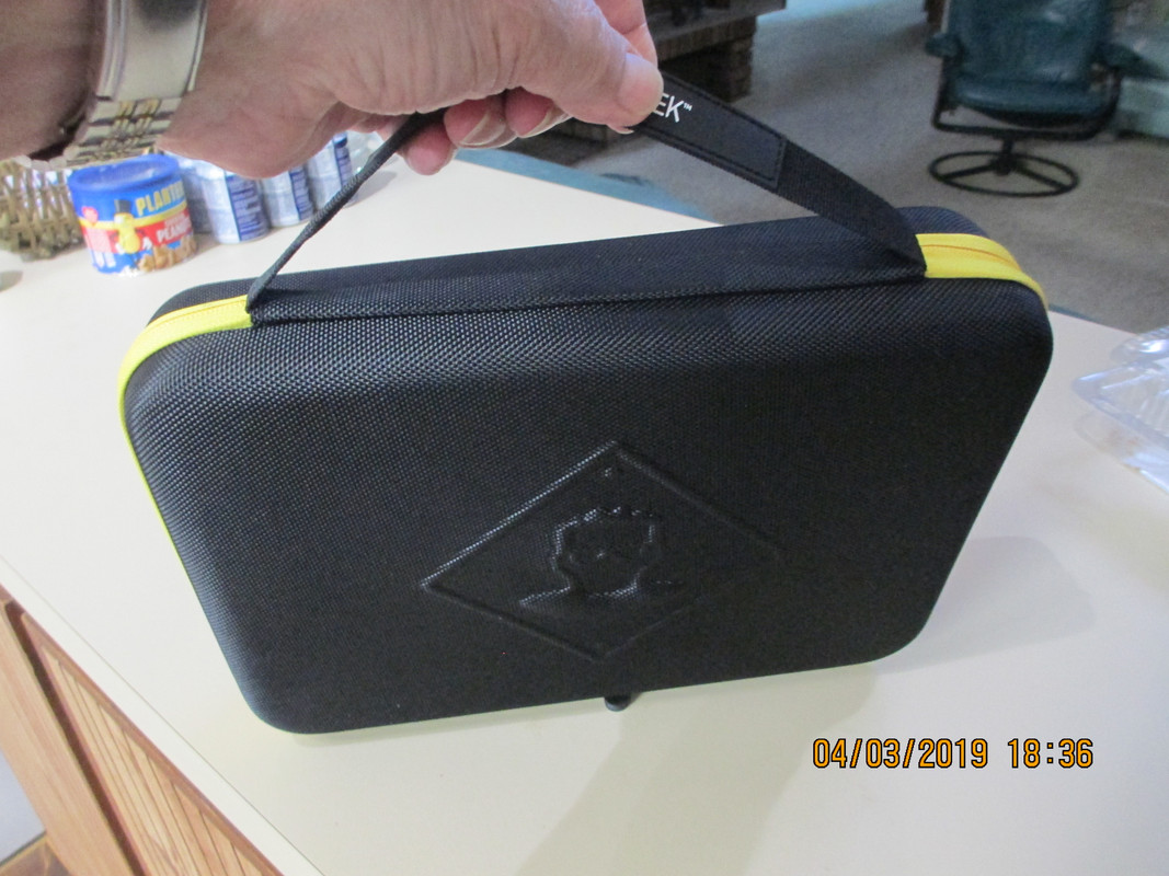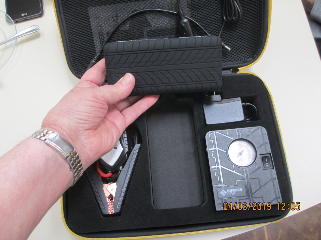 My wife asked what I wanted or needed, nothing really but she insisted. So, I suggested a Rugged Geek jumper kit to carry in the saddle bag. She asked why I would need something like that if it's not going to be used right away so I reminded her we have a 12 yr. old SUV with 69k on it and have never used the jack or spare tire. I then asked if she thought I would be wise to take them out and leave in the garage. She reached over and pinched me under the arm where it really smarts so I asked what was that for. Answer...."I hate losing an argument so quickly." Me...."I didn't know we were arguing." Her...."I was, you just weren't taking part".....then laughed. It came a day late but that's OK, I wasn't going anywhere. Kind of a nice present though and I gave "proper" thanks.  Case is about the size of a laptop.  I have a 9 1/2" spread just to give an idea of the size.  This little jewel is the heart of the entire system, not much bigger than a larger cell phone.  Really neat carrying case and it's semi-hard shell so not easily crushed.