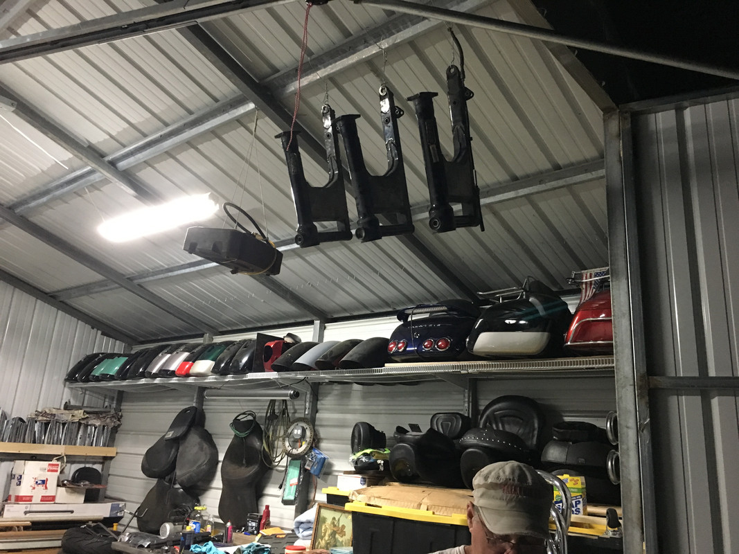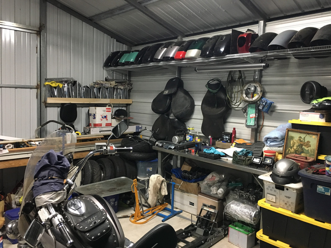 Following a fine repast, including a double order of bacon for this breakfast connoisseur, we returned to the den of motorcycle magic, and… Dennis worked his wonders once again! New brake pads, a close inspection of the drive train and a fresh application of grease filled me with confidence for all that hopefully lies just ahead… Speaking of that den, it is very well stocked with parts and stuff sufficient to make the head of any Valk wrench spin with envy!