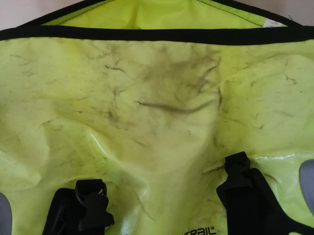 New at start of the trip. 4,500 miles later.  This is the portion facing forward on the rack behind me.