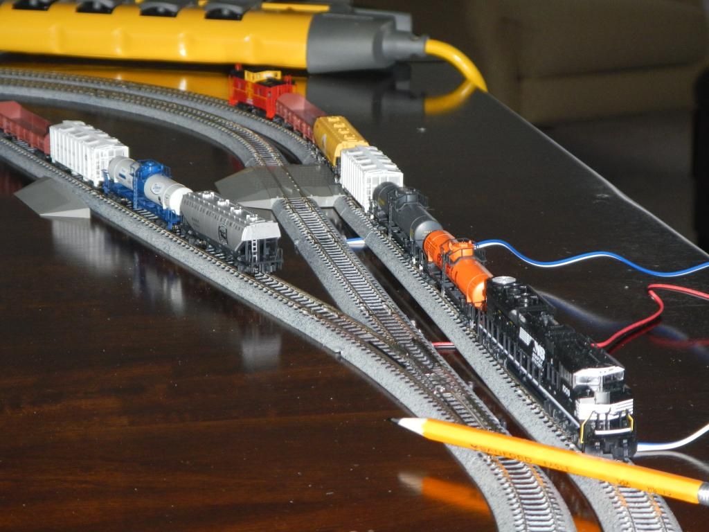 Model railroading, N scale . "N' scale stands for nine mm track width. Very small. I bought this for the Christmas tree. I added a few switches and more track with the intention of maybe putting the layout under a glass top coffee table. Here is the rough layout, just to see if it'll work (It will). This is Kato equipment, Japanese quality, not Chinese crap. The locomotive is a copy of the Norfolk and Southern diesel electrics that I see every day here in New Haven. Great detail even down to the yellow front grab rails and lights. The pencil shows the size. I believe that I'll proceed wih a coffee table layout and keep it modest.