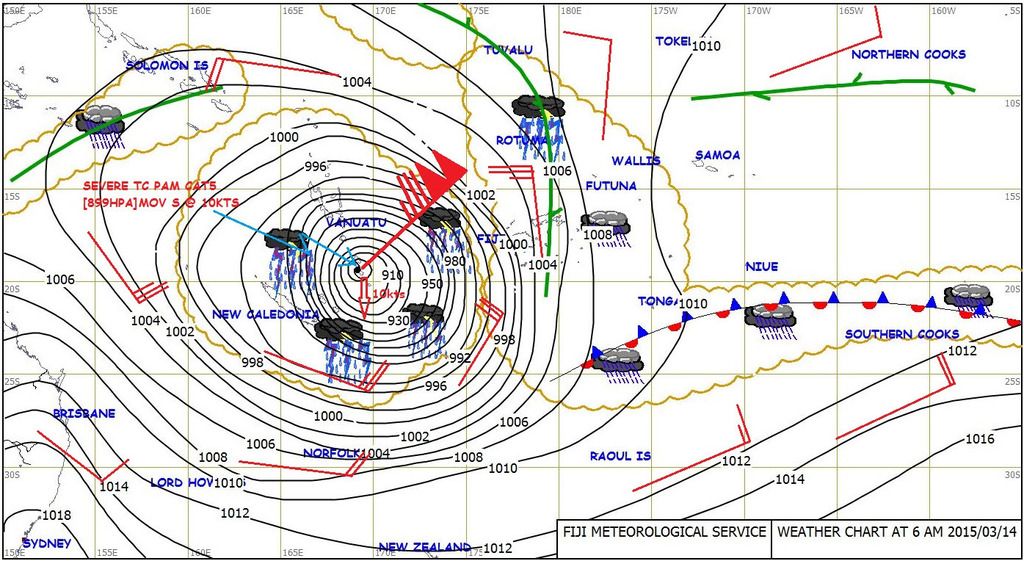 Cyclone Pam just nailed Vanuatu.  This system is huge, and would cover roughly half the USA land mass.  Cat 5, 135 knot winds - call it 155 mph, with gusts to 190.  Most of the population is now homeless.  We lived in Am Samoa from 2001 to 2008, and they live with the potential for these things every year.  You want to talk about rain?  I've seen 10" in about 12 hours.  Almost lost our boat there in Cyclone Heta in 2003, which was another Cat 5.  Cat 5's hit land about once every 5 years.  We moved to Tucson in 2009 - much less chance of drowning here... Grin