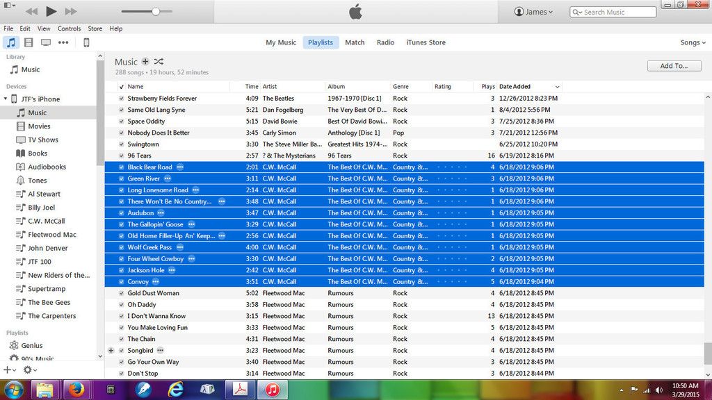 Or you can ignore (turn OFF) the sync function and manually add or delete songs from the iphone. To delete, simply click the iphone icon in iTunes and then click Music to show the songs on the iphone. Highlight the songs you want to delete (the C.W. McCall songs in the photo below) and right click. You will be given an option of deleting the music. To add music to the iphone, click the top Music selection (under Library and above Devices) which will show all the music on you computer Tunes. Highlight the music you want to add and "move" it to the iphone (on the left under Devices) with the mouse. You can create a playlist on the iphone by highlighting Music under iphone and then clicking the "File" option (upper left), then New, then Playlist. This does not use the sync function at all.
