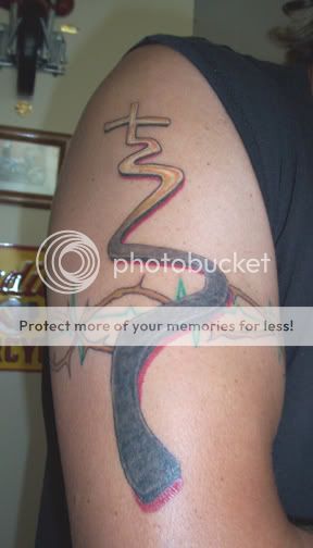 The tattoo I have on my right arm is a conglomeration of symbolism.  First it is derived from the Cross of "the way" at the Eli Cathedral in England.  They have it as a memory of Christ's steps to Calvary they refer to it as the "way"