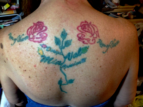She has a tat on each shoulder, basically mirror images of a rose where the stem is made from the sentence, "Rose of Sharon." My name (GUY) is hidden in the rose petals.
