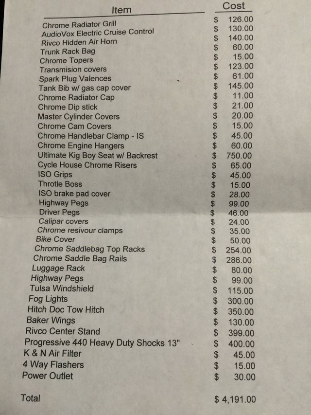 Again, thanks for the advice Carl. The problem Im having while were sitting here Itemizing all my Xtras, we are already over 3K and still have my Waynes World and other big ticket items to account for. So when I show this adjuster my "high dollar itemized list" his mind is going to go cha ching on the salvage value and how much he,s willing to sell me the bike back for. I have no intention on signing anything over, as I intend to keep the bike. Hopefully the plan is to be able to salvage enough cash out of this deal to be able to buy another used State and rebuild this one "stripped down" for Faith.