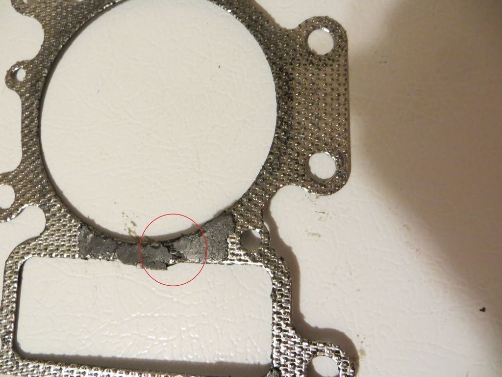 Got the head gasket changed tonight. Took more like 4 hours than 1. I'm 99% sure that was the problem. You can see the gap in the gasket and I could also see the blow-by trial on the engine block. Just one stupid question. The gasket set came with two (2) head gaskets. I assume I was only supposed to one--the one one that matched the one I took off? Thanks for all the advice.   i believe you assume right because if one is different then you couldnt use it anyway..
