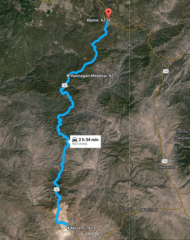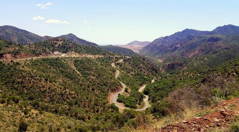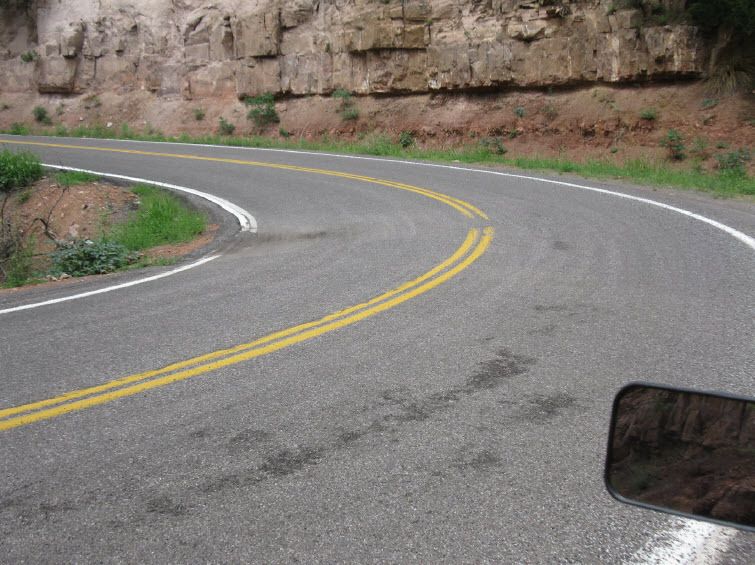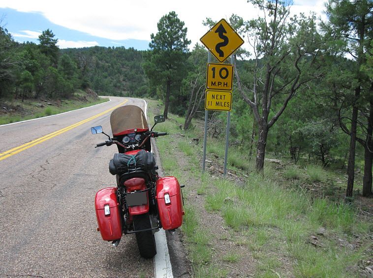 Here's a fun one for all you left coasters.    The old 666, which was renamed in the early 90's due to all the road signs being stolen. I know a few folks who won't ride/drive it; like a guy at work on an ST1100 who calls it "boring"  . Then again, he's looking at switching to a Harley ???. IMHO, best road in the world. I've ridden it prolly 50 times in the last 10 years. A few years ago we rode it twice in one day; departed from Alpine headed south, and once at the "bottom", the river at the "Mines of Morenci" were about 6" from cresting the bridge road, necessitating closing the flood doors to the town. Had to ride it again back to Alpine - turned into a 400 mile detour to get home...  Different reviews count different curves, but a few years ago wifey and I tried to count them. We lost track at about 650. The road starts in desert, goes thru the largest open pit mine in the country, then climbs almost 5000 feet to Alpine. No traffic, lots of curves, some 80mph, some 5 mph. Few guardrails, no cell phone coverage. Lots of big valley and mountain views. Occasional debris from streams crossing the road to keep you honest. Have seen cows on the "wrong" side of the fence, mountain goats maybe every other trip, and once a massive swarm of giant grasshoppers (2-2.5") on the move crossing the road. Greasy sob's...   In all the times I have ridden this, max was maybe passing a dozen cars in 90 odd miles -that's counting both directions. Oddly enough, not that many bikes. Been passed by a couple crotch rockets... and have passed a bunch of Harleys running at flank speed...