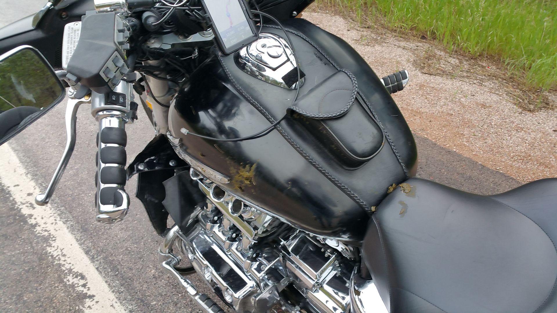 I had a wonderful time at Inzane and thank all of my past friends I came across as well as the new folks I met. Also thanks to the Staff for putting on another Superb Inzane. Early Friday morning, I left Ground Zero around 6:30 am and set off to see my daughter in Fort Collins, Colorado. I was packed to the gills and was very pleased to see my route took me for a third trip through Spearfish Canyon. The weather was very cool and made me very alert to my surroundings and to my trusted steed-the Dragon. At one point, I even saw a deer approach the highway and then do a U-turn and scamper off. I thought to myself, "Who needs deer whistles when you have MarkT pipes with trombones in?" I laughed. There's a little bit of irony in that statement...I came to realize. Continuing onward, I entered Wyoming and was traveling down Route 85. I was making good time but was sticking to the generous posted speed limit of 65. Had tunes going though my headset when a vision caught me out of the corner of my left eye...COLLISION COURSE. I swear I had only a half second to brace for impact and impact it was. I hit the young doe head on direct. In spite of what the bike looks like, I guarantee I was doing every bit of 63mph at impact. I didn't go down but took about an eighth mile to stop. Luckily, it was witnessed by a gentleman who stopped and gave me his business card. He said, "Holy Crap, I saw the whole thing and can't believe you kept that bike upright!" He mentioned he was doing 71mph and gaining on me and estimated me to be going mid 60s. After thanking him, I looked over the bike. It really didn't look too bad for being in a violent collision. I then did a quick self analysis. I wasn't really hurting anywhere except a slight bruising of my left shin, where I probably caught her body as it came around. The bike seemed "reasonably" intact. I didn't see any obviously bent forks. The fairing was creamed and my left pod was pretty much gone. My #4 velocity stack was broken away from the carb. My fender and gas tank were dented. What to do, what to do. My only thought was of logistics now and how to get myself, and the bike HOME! I called my daughter and told her I was going to have to take a rain check and I was going to see if I could head for home. There's no way I wanted to leave the bike in Bum F_ _ __, Wyoming(actually I was about 5 miles north of Newcastle) and try to figure out how I was going to get home. I had that happen last time where I wasn't able to remove my chrome and stuff before the bike went bye bye. I wanted it to be on my terms this time. I proceeded slowly at first just to make sure "most" of the bike's faculties worked. Believe it or not, the bike performed pretty well. I didn't have any headlights whatsoever...no working front turn signals and had an 1100 mile journey ahead of me. That was pretty daunting but I'm no wimp. My number one concern was how to navigate that 1100 miles without getting stopped by a cop and having the bike impounded. I traveled a lot of back roads, especially through Iowa. Went through many small towns and went by a few cops that were already talking to stopped cars and didn't see me go by, I guess. I had to stop for the night and get a motel around 6pm Friday because I had no lights and didn't want to be unseen with a black I/S and no front lighting. 660 miles down and 430 to go. I made a mental game to have a moral victory each time I was able to go under another 100 mile mark. I negotiated a lot of back roads, went through a lot of small towns and held my breath that the local Barney Fife wasn't going to be the one to get me after traveling 700 miles. I made my way to Route 80 and decided I'd take my chance with the State boys. I was so wanting to stop and see RJ but couldn't with my bike in the current state. Will have to make that another time. Sorry, RJ! From I80E I got to I88 in Illinois and brought her home at about 3pm. Maybe next year at IZ I can get the award for "Who's traveled the most miles(1100) after striking a deer at 63mph without making any bike repairs" ? Sorry this is so long but I'm really bummed. I don't want my insurance to go up for 3 years on 3 vehicles and am debating on even turning it in. I know I have about 3-5 grand in damages. The bike does pull slightly to the right if I let go of the bars so I might have a bent right fork. What to do, what to do. Pics to follow.  In this next one, notice my left highway peg bent clear around. I'm glad I usually ride with a "hurdler's stretch" with my left leg back on the rider peg and my right leg on the highway peg. And folks, that's deer skat on the gas tank, the Day Long seat....and on my jeans. I DID check and it wasn't my own..      And now a pic of the villain... Can any of you deer hunters estimate weight, based on the pic?Thanks.