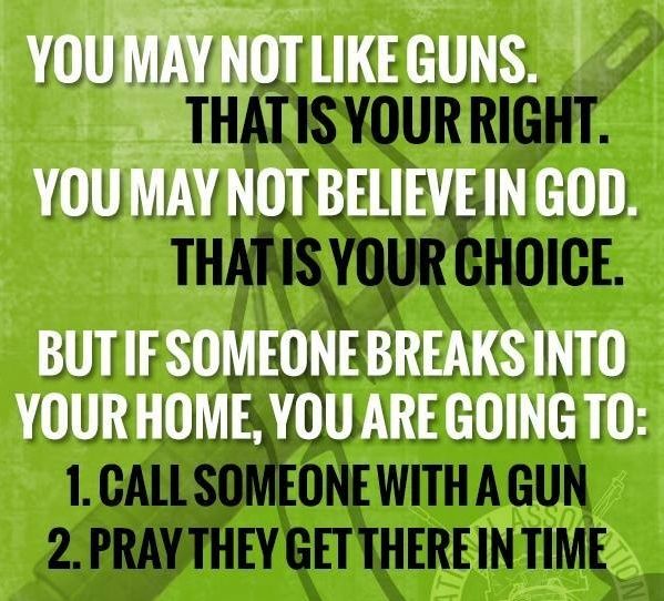 I don't really like getting into gun debates. All I know is, I feel a whole lot better with the guns in my closet if intuders come to my home to hurt my family, than not having them at all. I don't know if I could personally handle myself against one or more intuders, in fact, I probably cannot, especially if they are young. However, from 40 feet away, God forbid, and I hope the day never comes, I can put one right in them and not miss. I didn't create the world we live in, I'm just trying to live in it! I also would feel a lot better in a movie theatre or public place knowing if a nut job gets out of hand, that there will be others capable of stopping him, than finding out no one can stop him. My bet is all those opposed to gun rights would change there stance if they were attacked in their home or public place.