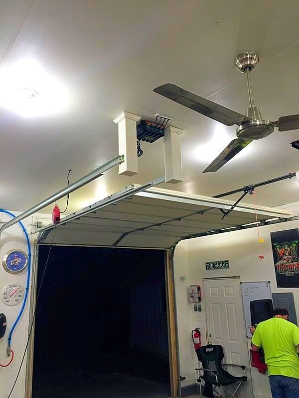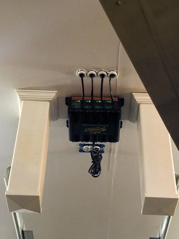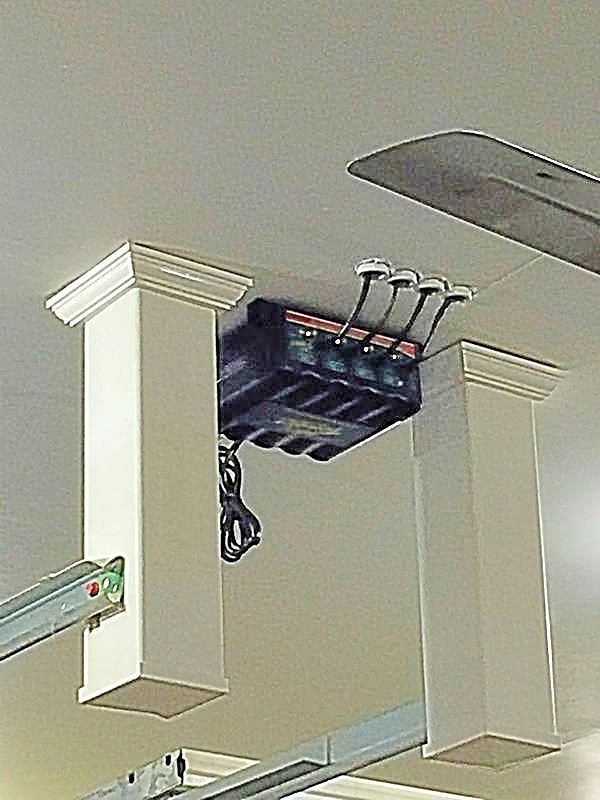 I mounted the Battery Tender to the garage ceiling and then drilled four 1.25" holes into the ceiling in a row.